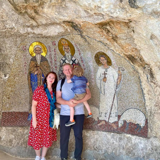 Once at the top, there stood Ostrog in all it’s peaceful beauty. Pilgrims and tourists were met with a grand archway with large mosaic icons filling the upper part of the arch. Through the arches was utter and complete serenity. There were, of course, many Orthodox Christians of numerous jurisdictions (for those that don’t know, this is primarily a cultural difference - the tenants of the Orthodox faith and the services are the same no matter where you go, but there are cultural differences between Russians, Arabs, Greeks, Romanians, etc.), and there were also visitors from all over the globe. We first found our way to buying some beeswax candles, and lit them in the candle room on the lowest level of the monastery. This was an unbelievably moving experience. Then, we made our way up to the second level of the Monastery in the side of the cliff. We were able to venerate the relics of St. Basil of Ostrog who is best known for working miracles with the sick and those with chronic or life consuming conditions, as well as, turning doubters or non-believers, into believers.